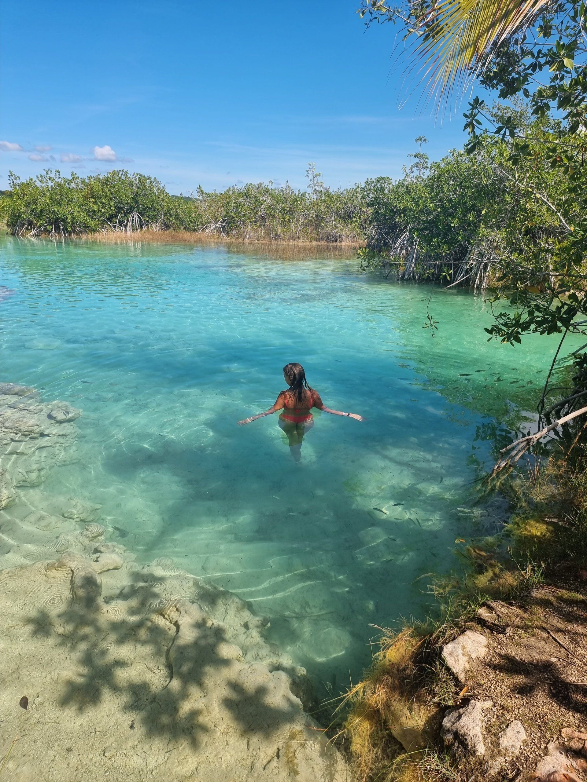 Par la suite nous nous rendrons au cenote Cocalitos, ce cenote fait partie intégrante à la lagune de Bacalar. L'eau y est également magnifique et chaude. Malheureusement à l'heure où nous sommes arrivés il y avait pas mal de monde, je vous recommande donc, si cela est possible, de venir tôt le matin pour apprécier totalement cet endroit. Le prix d'accès au cenote est de 50MXN par personne + 30MXN pour un casier.